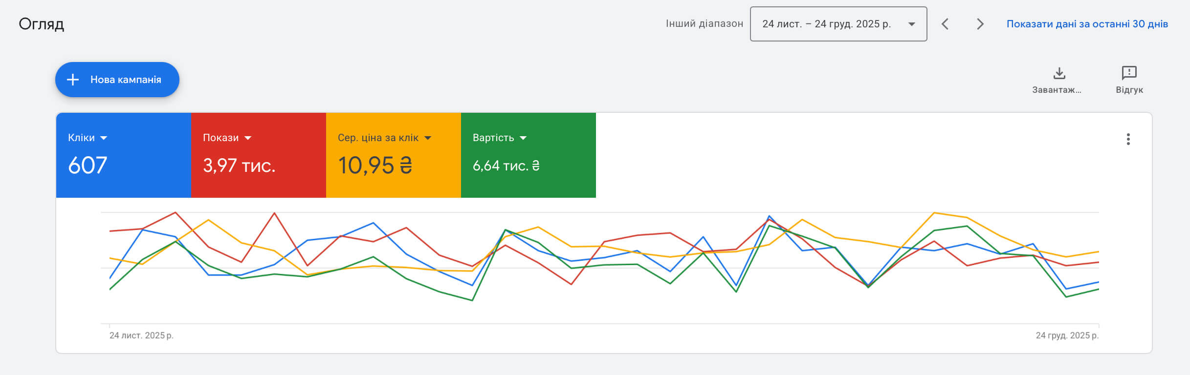 Протягом звітного періоду рекламні кампанії в Google Ads згенерували 607 цільових кліків при 3,97 тис. показів. Середня вартість кліку склала 10,95 грн, що є ринковим показником для конкурентної ніші. Загальні витрати на рекламу за період становили 6,64 тис. грн, при цьому кампанії демонстрували стабільну динаміку без різких просідань, із контрольованими витратами та прогнозованою ефективністю. Налаштування та оптимізація дозволили отримувати релевантний трафік навіть за обмеженого бюджету.