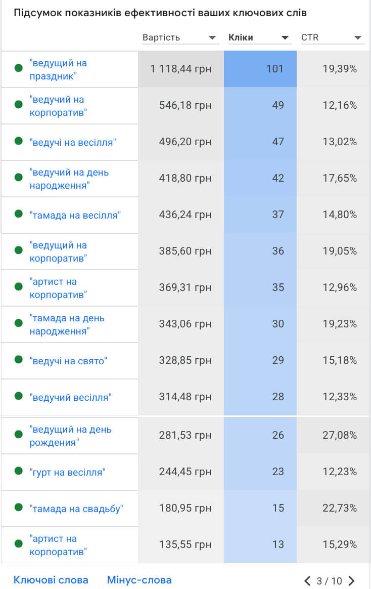 Протягом періоду ведення PPC-кампаній для гумористичного колективу VIP Тернопіль було сформовано стабільний потік цільових показів і переходів на сайт (гео: вся Україна). Рекламна стратегія базувалась на пошукових запитах із високим комерційним наміром — “ведучий на весілля”, “ведучий на корпоратив”, “тамада” тощо, — з адаптацією оголошень під різні формати подій та регіони. У результаті реклама забезпечила прогнозований попит, регулярні звернення та системний притік лідів із різних міст України.