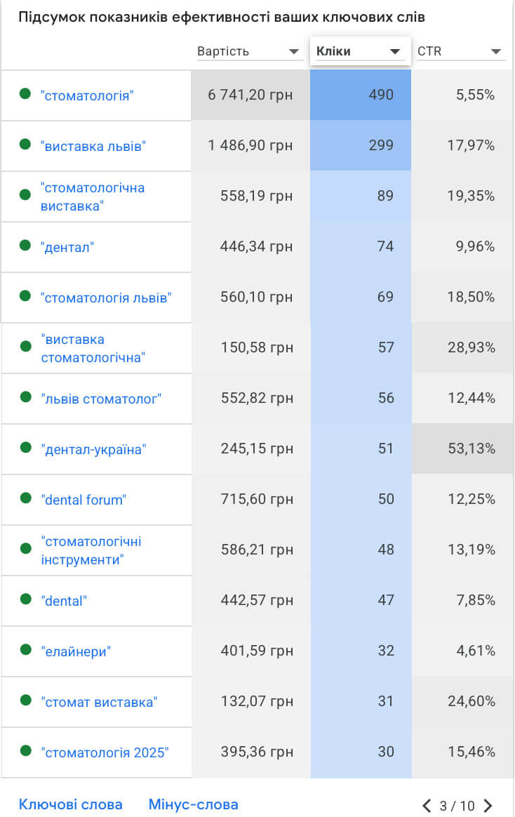 Протягом періоду ведення PPC-кампаній для стоматологічної виставки у Львові було сформовано стабільний потік цільових показів і переходів на сайт із пошукової та банерної мережі Google Ads. Рекламна стратегія будувалась на запитах із високим комерційним та професійним наміром — “стоматологія”, “стоматологічна виставка”, “стоматологічне обладнання”, “виставка для стоматологів”, “стоматологічні матеріали” тощо — з розширеним геотаргетингом на західну та центральну Україну. У результаті кампанії забезпечили прогнозований інтерес до події, регулярні реєстрації від фахівців галузі та системний приплив релевантних лідів у межах контрольованого рекламного бюджету.
