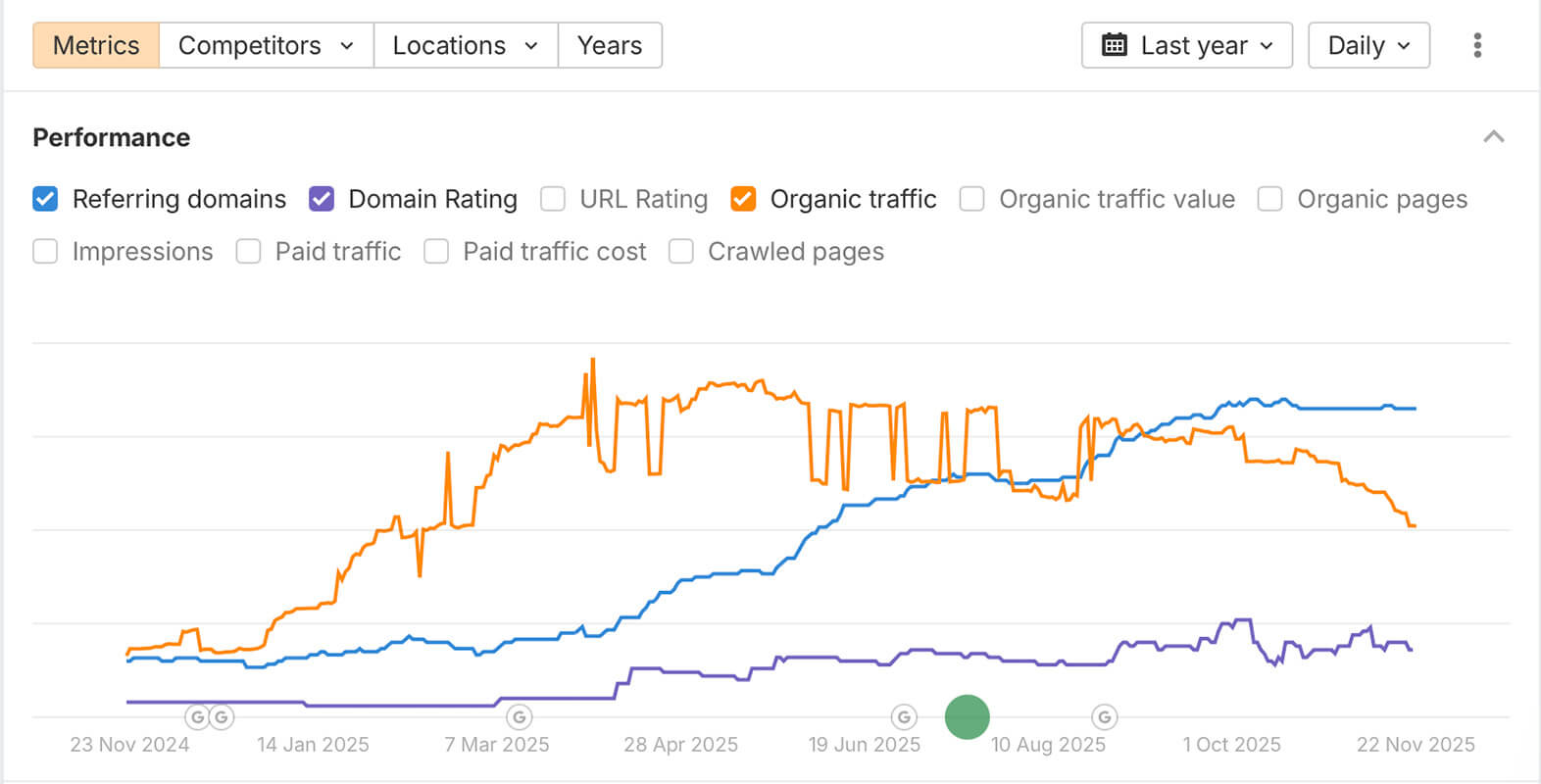 Паралельно зросла авторитетність ресурсу: кількість якісних реферальних доменів підвищилась майже удвічі, що підняло показник загального рейтингу домену. Сайт став конкурентнішим у своїй ніші, значно наростив довіру пошукових систем і отримав стійкий фундамент для подальшого масштабування. Сукупність цих факторів свідчить, що обрана стратегія була ефективною та забезпечила швидкий результат у лімітований період просування.